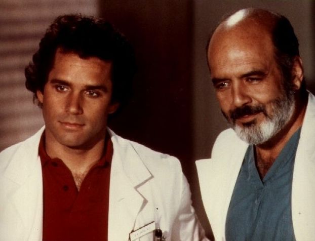 Pernell Roberts (right) as an older Dr. John McIntyre, with Gregory Harrison (left) as Dr. George "Gonzo" Gates from Trapper John, M.D..