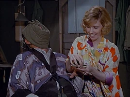 Later we see Stevens giving Henry a facial and a manicure. She offers him clear polish or a high buff. Henry chooses the buff but before she can get very far with that, Hawkeye and Trapper storm in to berate Henry for listening to Frank's complaint about Weston and signing a dishonorable discharge for him. Henry protests that he has refused to sign. This satisfies Hawkeye and Trapper so they leave to go after Frank instead. After they leave, Henry is still bewildered about why he got the scolding from them and he asks Stevens to look inside his ear and tell him what she sees in there.