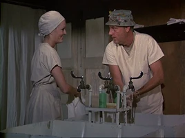 Two episodes later, in "Hot Lips and Empty Arms" the nurse, now credited as Watson, is helping Frank and Hawkeye in the O.R. Now it is Hawkeye's turn to chat her up. He asks her what she is doing after the operation, but this leads to Margaret (who is in a bad mood) reminding them sternly that the O.R. is not a cocktail lounge. She comes over and reprimands Watson for not keeping an accurate count of the lap sponges. Watson says she counted ten but Margaret can only see nine in the bucket. Watson is sure there is none in the patient. Margaret looks around and finally spots the missing sponge on the floor. She tells Watson to be more careful the next time as they might have had to open up the patient again.