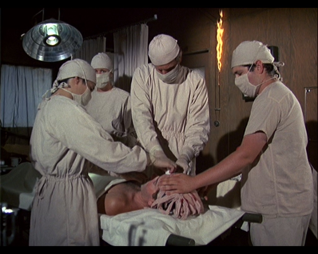 The grueling session finally ends with Hawkeye nearly passed out on a gurney in a nearly empty O.R. while Trapper slowly wheels him out.