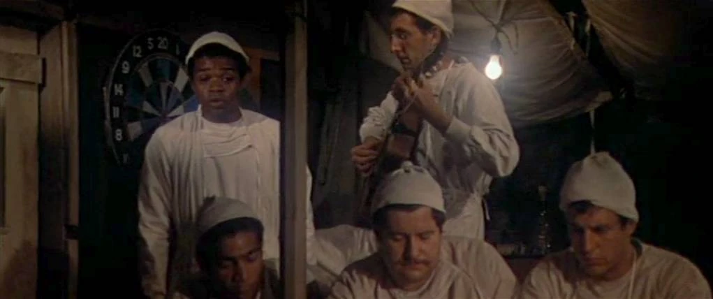 "Suicide is Painless" as originally planned - sung by Private Seidman (Ken Prymus) accompanied by Captain Bandini (Corey Fisher) on the guitar during the fake suicide of "Painless Pole" Waldowski.